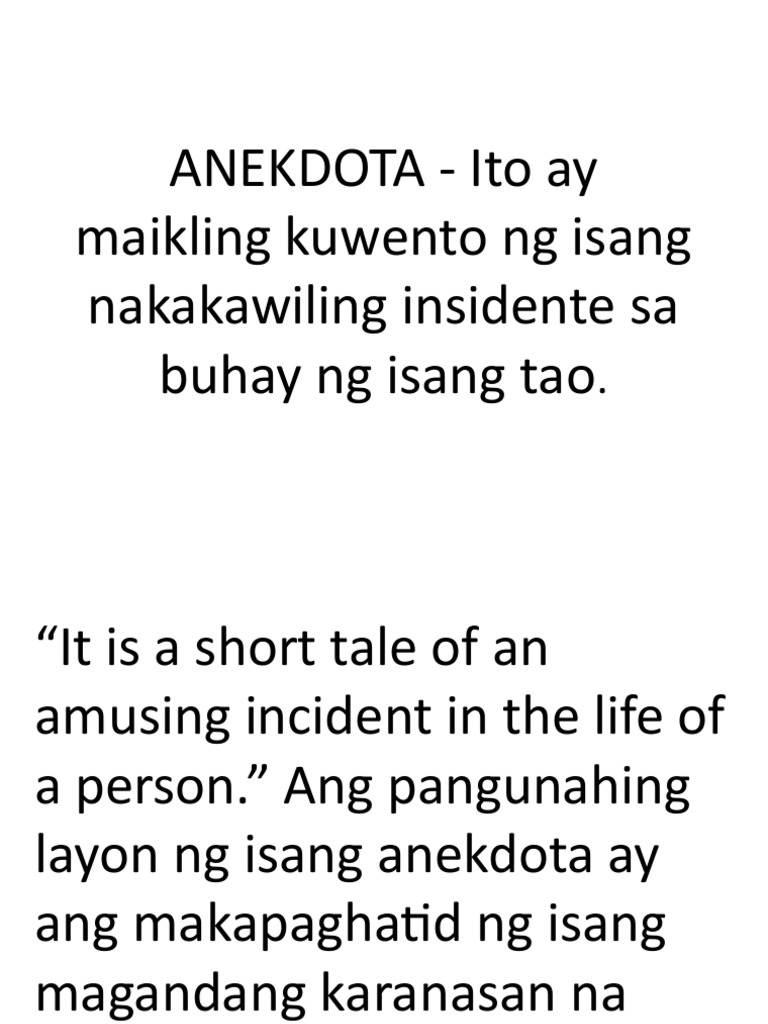 04052016 Ano ang Anekdota. Ito ay akdang tuluyan na hango sa karanasan ng isang kilala sikat o tanyag na tao. Layon nito na magbatid ng isang magandang karanasan na kapupulutan ng aral.