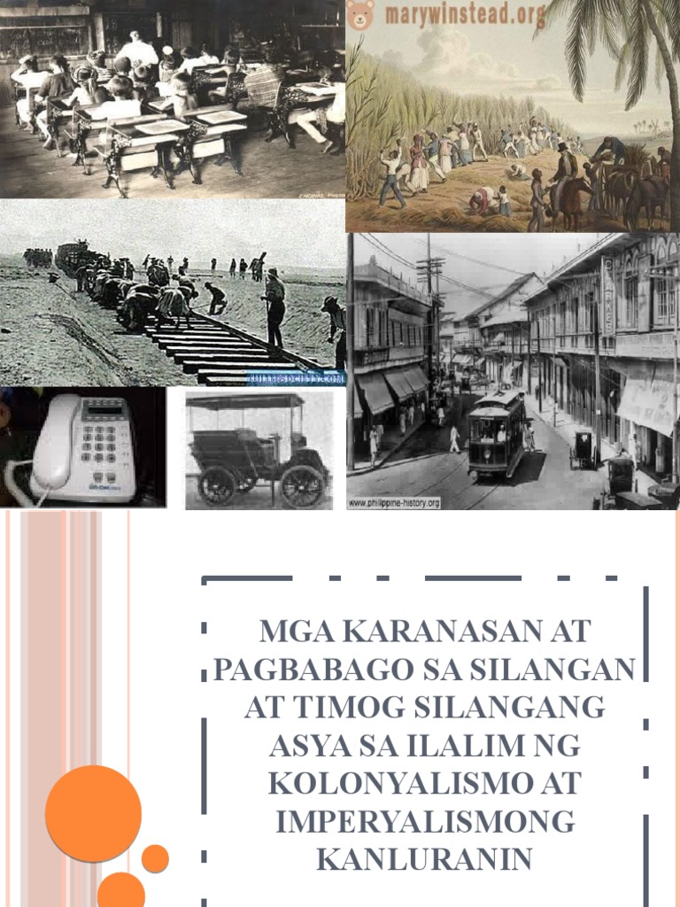Kolonyalismo at Imperyalismo sa Silangan at Timog Silangang Asya Upang maisakatuparan ang kanilang mga layunin nagtayo ng kolonya ang mga Kanluranin sa Asya. Ang Transpormasyon ng Timog Asya sa Ilalim ng mga Kanluranin.
