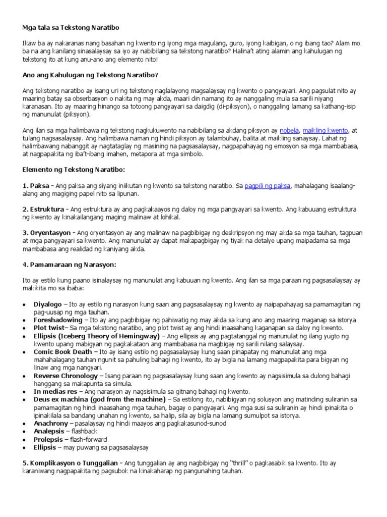 Tradisyonal na kwento o pangkat ng mga kwento tungkol sa isang partikular na tao o lugar. Ginagamit ang tekstong naratibo upang magbigay leksiyon sa mga bata sapagkat nagkakaroon ng moral lesson o matibay na konklusyon sa huling bahagi ng naratibo. Http Ead Laboro Edu Br Doc Naratibong Teksto Halimbawa Ng Pasalaysay Na Kwento Pdf.