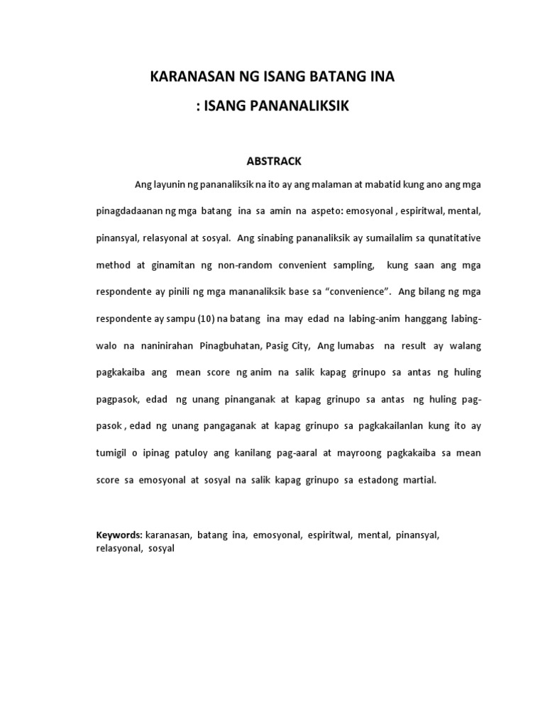 Ang sinabing pananaliksik ay sumailalaim sa quantitative method at ginamitan ng nonrandom convenient sampling kung saan ang mga respondente ay pinili ng mga. Talagang ang ganda sa pakiramdam kung nagagawa mo kung ano ang gusto mo ng walang sagabal walang nagbibigay ng limitasyon at walang pumipigil hindi ba. Karanasan ng isang batang ina Abstrak Ang layunin ng pananaliksik na ito ay ang malaman at mabatid kung ano ang mga pinagdadaan ng mga batang ina sa anim na aspeto.